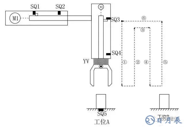 如上圖所示,M1為控制機(jī)械手左右移動(dòng)的電動(dòng)機(jī),M2為控制機(jī)械手上下升降的電動(dòng)機(jī),YV線圈用來控制機(jī)械手夾緊防松,SQ1為左到位檢測(cè)開關(guān),SQ2為右到位檢測(cè)開關(guān),SQ3為上到位檢測(cè)開關(guān),SQ4為下到位檢測(cè)開關(guān) ,SQ5為工件檢測(cè)開關(guān)。
